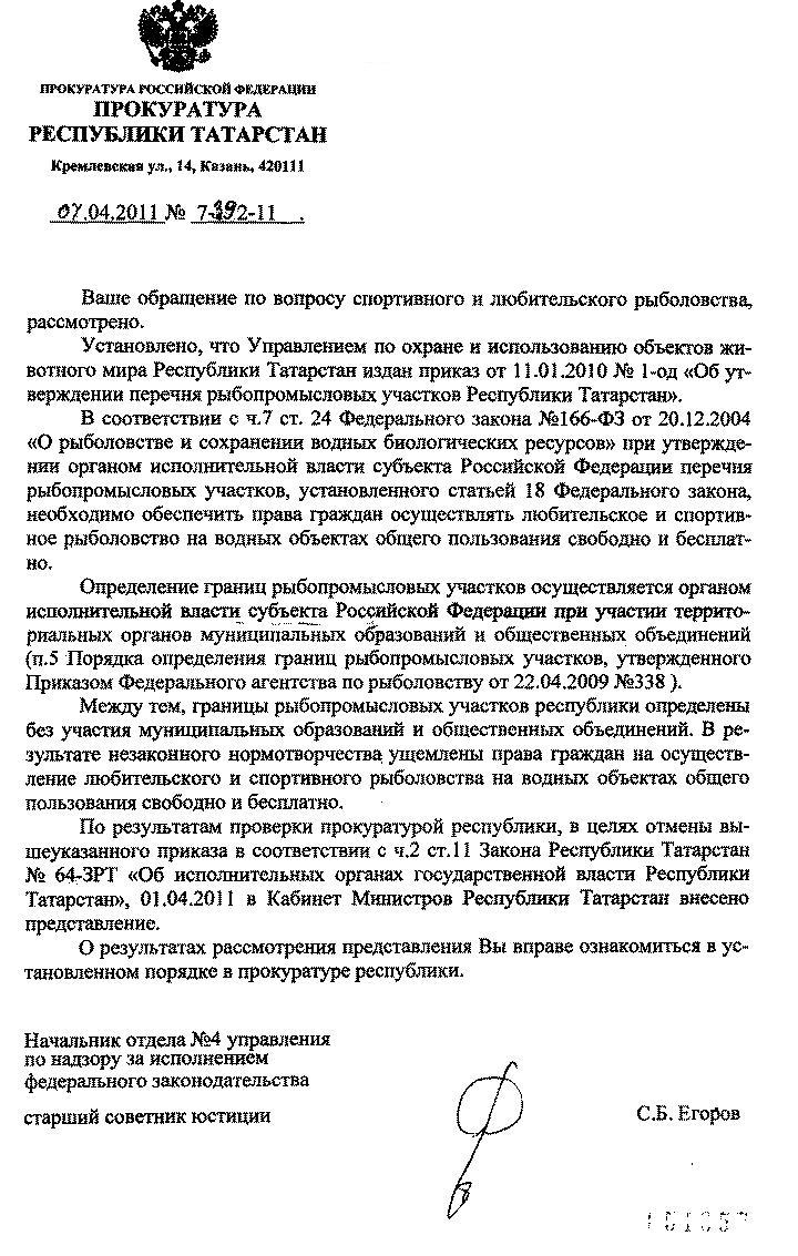 В общем, все то, что писАл Коммерсантъ, только в сжатом виде, сам начальник отдела №4 управления по надзору за исполнением федерального законодательства господин С.Б. Егоров мне лично в письме изложил. Ждем-с результатов рассмотрения представления Кабинетом Министров РТ, с которыми Мы (