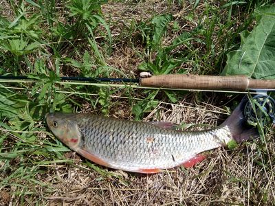 В 12 было решено ретироваться. На обратном пути нереализованное желание поймать лобастого вынудило остановиться на какой-то речушке. Подойдя поближе благодаря очкам в толще воды увидел силуэты стайки вожделенной рыбы, все грамм по 200 с виду. Пока готовил снасть, стайка уже ушла. НО. Но приплыли три экземпляра действительно внушительных размеров. В длину голавлики были сантиметров по 40. Два взмаха, чтобы почувствовать движение шнура, заброс. Мушка падает на их пути и начинает медленно погружаться. Тройка приближается к приманке. Еще секунда и... ПОДСЕЧКАААААА. Здоровяк на крючкееееееее!!! Палка согнулась в дугу, от натяжения шнур "запел" и рыба как мощный тягач, борясь с пружинящей тенкарой двинулась в ивняк рядом со мной. Я, не привыкший к борьбе с таким соперником, использую деликатнейшую палку, начал лихорадочно смотреть то на палку-"не треснет ли она пополам?", то на рыбу-"не удерет ли от меня в кустах?"