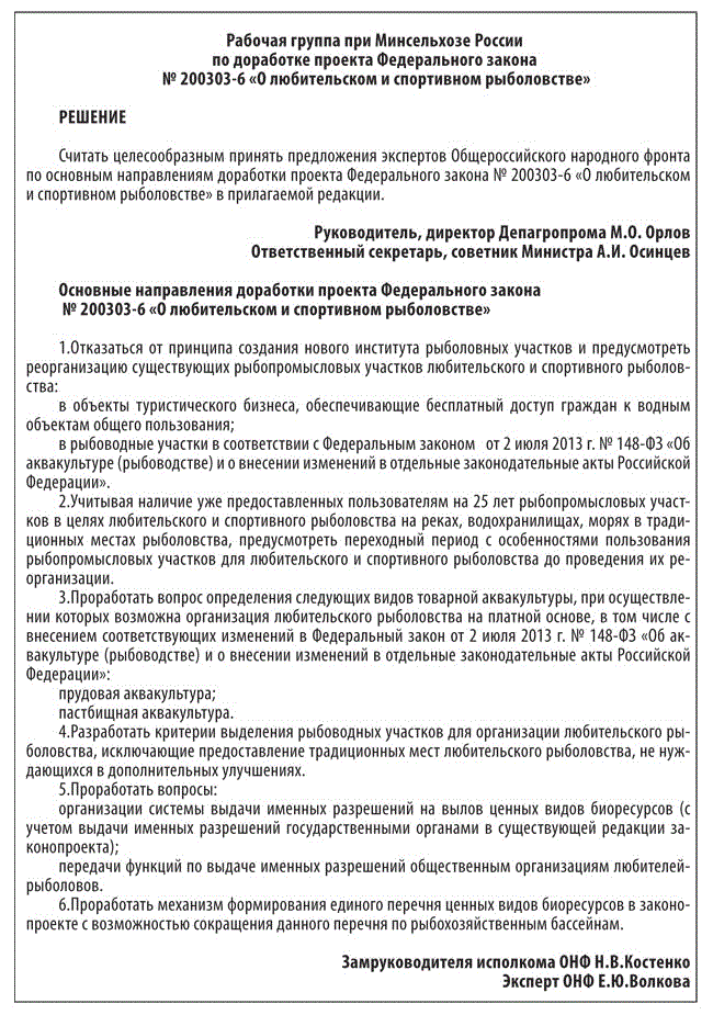 Эксперты ОНФ активно включились в работу над законопроектом и, несмотря на жесткое противостояние со стороны эрпэушного лобби в лице представителей астраханских баз, смогли добиться понимания своей позиции в Минсельхозе. Об этом говорит подписанное на прошлой неделе совместное решение рабочей группы Минсельхоза и ОНФ по основным направлениям доработки проекта Федерального закона «О любительском и спортивном рыболовстве».