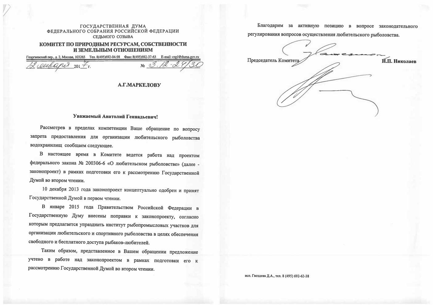 Председатель Комитета Госдумы по природным ресурсам Николай Николаев отвечает на письма рыболовов по поводу законопроекта "О любительском рыболовстве". В приложении - один из ответов.