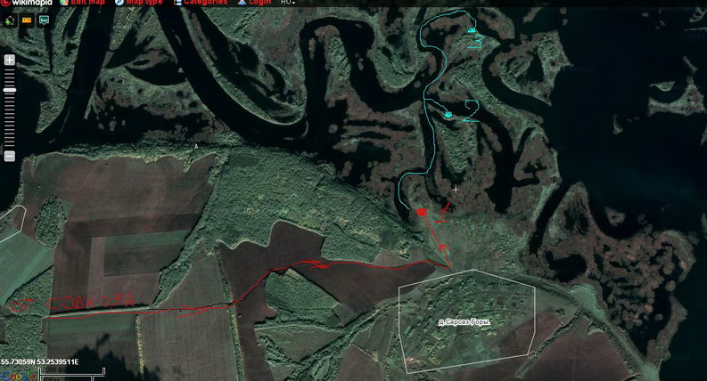 От совхоза идем к соцгорам, спускаемся с горы и сразу налево под гору. На карте отмечено точкой 1. Можно остановиться прям тут. Далее на лодке до "перекрестка" водного, и там ищем место на островах. Предпологаемые стоянки (если не будут заняты) цифры 2 и 3.
