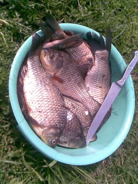 Мешинские разливы. Погода супер. Вода прибыла и это очень радует, т.к. есть где полазить с удочкой и спиннингом. С утра поискал хищника, нашел в виде щучки под кило, отпустил подрастать до осени. Взяла на колебалку Мепс 17 гр. Хорошея блесна часто выручает. Были тычки, поменял на вертушку, а это окушки за блесной идут и у самого берега (камыша) на перегонки кто первый схватит, садятся на крючок. Окушки тоже домой во свояси отправил подрастать. Вокруг все интересней становиться, карась (гибрид) в камыше чмокать начинает. Нашел окошко в траве 3х3, глубина 0.5 м., прикормил, из спина что то типа удочки изготовил, заброс, поплавок вздрогнул, лег на воду, подсечка подлещик, потом еще один и тишина. Рядом камыш против ветра по сторонам гулять потихоньку стал. Я в окошко грунта подкинул, муть поднял. И тут поклевка, уверенная, в камыш. Первый гибрид, хороший под 0.5 кг. Потом еще, еще, так с 10-к успел поймать, потом обрыв, да и домой пора, жене обещал за грибами сходить (маслята пошли в молодых сосенках, ну очень много) Итог рыбалки на фото (правда часть рыбки успели "родственники" умыкнуть.