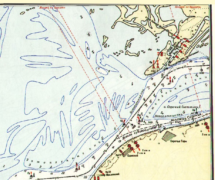 Смотри, где судовой ход - там затопленное русло )) Лоция хоть и 90 года, но в принципе особо не изменилась, имхо...