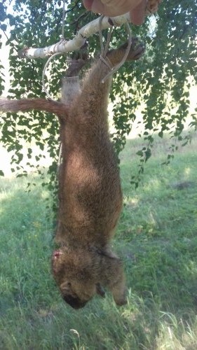 Охота заняла часа полтора и минут тридцать на разделку. Стрелял метров с 20-25. Шел на свист не видя сурка, в какой-то момент он свистеть перестал. Прошел еще метров 30, остановился и начал смотреть бинокль. И тут он как закричит, я аж вздрогнул. В траве сразу его не увидел. Минуты две искал его глазами, когда нашел потихоньку снял ружье с плеча, начал выцеливать и тут... звонок телефона. Быстро успел сбросить вызов, а сурок так и сидит и смотрит на меня. Прицелился, выстрелил, подбежал. Лежит готовый. Попал в шею. Калибр .223Rem.