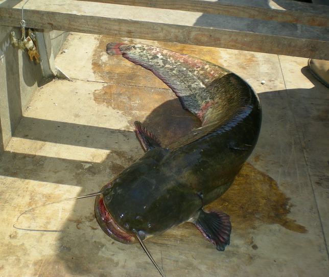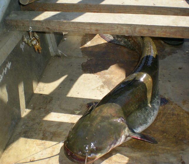 На втором забросе - класcика: зацеп, да нет не зацеп, вибрация есть. К лодке шел легко без выкачиваний, одной катушкой. То что началось около лодки словами не передать. Визг фрикциона (шимано отработал на 110%), леска режет воду, нырки под лодку, спиннинг в дугу на 180%... Лишь бы не намотать на якорную веревку... Обессиленного жереха подвел к лодке, пытался обхватить одной рукой - хрен там. Потом неуклюже прижал к лодке и перевалил его через борт. Руки тряслись еще минут 10.