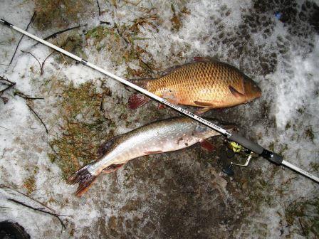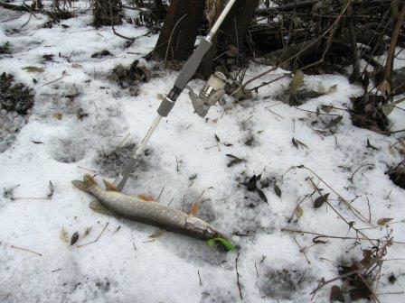 Щучки ловятся на джиг, как маленькие, так и до 2-2,5 килограммов. Конечно, зимой щука вялая, не то, что летом. Но всё равно в таких условиях предпочитаю использовать спиннинг достаточно мощный, который позволяет не церемонится с клюнувшей рыбой, и не дав ей разгуляться или спрятаться за корягой, вытащить на берег.