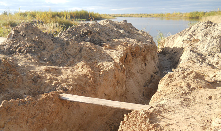 Действительно прорыта канава шириной примерно 2,5м. Пока там воды нет. Но весной похоже будет полноценная протока. Через канаву установлена доска. Но она очень хлипкая. Я сегодня прыгал.