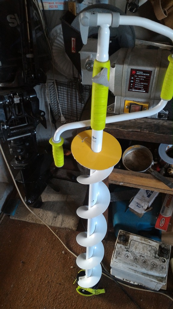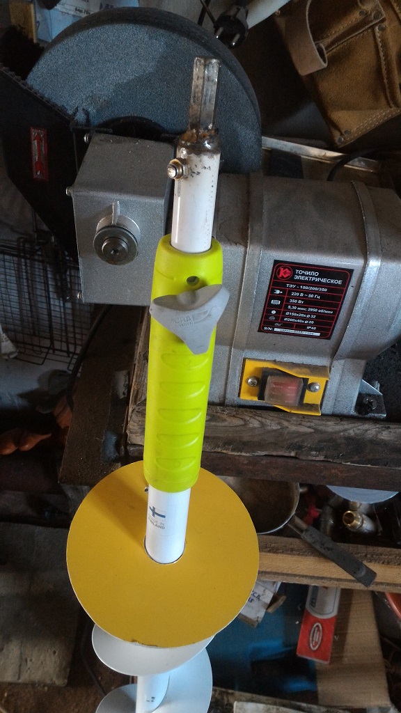 В субботу на рыбалке начала клинить ручка - переходник HIGASHI , чуть палец себе не выбил. Хватило на три рыбалки. Сегодня разобрал ручку, там нет никаких втулок, потому и заклинило. В итоге вместо ручки приварил диск 200 мм, чтобы бур не утопить в лунки.