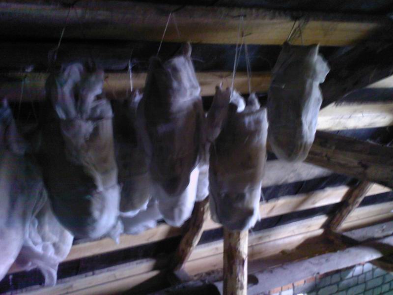 на фото- тушки завернуты в марлю. Но это не очень хорошо. Через марлю мухи откладывают яйца, и продукт испорченю лучше завернуть в бумагу.(такая коричневая, плотная)