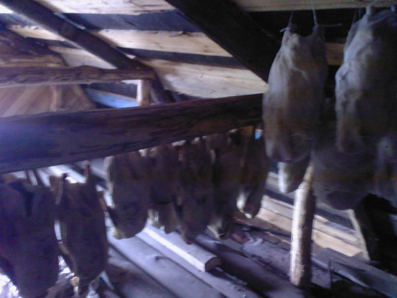 Чисто для эксперимента у меня на балконе, в обычной коробке, завернутый в тряпку, лежит четвертьгуся. Вялил в 2009 году, осенью. Созрел на чердаке, летом 2010 года, частично выгрызался