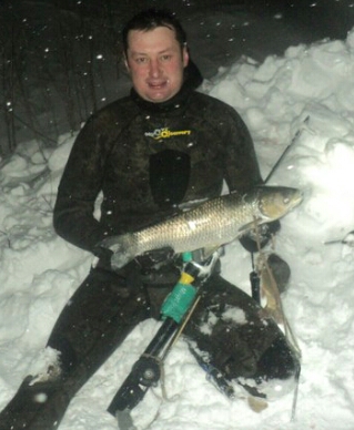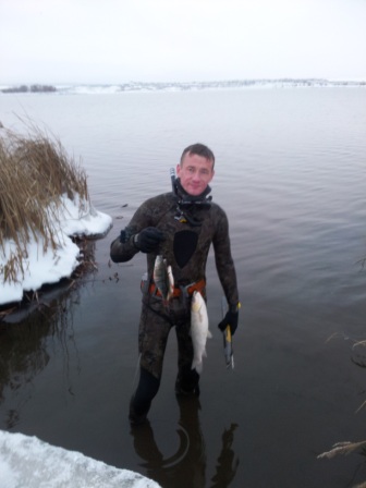 Открыл сезон 2013г в Заинскке. На этой акватории впервые так что места и рельеф дна не знакомый. Доехал до рыбхоза местного , пообщался там с местными контенгентом сказали где можно плавать где нет. Пока переодевался на берегу подъехал еще один подвох из казани зовут Саня, как выяснилось он тоже в первый раз тут. В общем залез в воду, водичка класс, прозрак тоже отличный метра 3 есть после нашей осенней волги этот прозрак как вморе по ощущениям . На дне канала до садков множество сетей старых и касынок, мелочи в ней тысящи дохлых и живых пейзаж конечно не радует. Далее спускаясь в низ по течению проплыв садки и дальше искал хоть каакиенибудь не ровности дна и глубину, но к сажелению глубину больше 3-х метров не нашел, но зато нашел перепад с 3-х на 2 метра. Активный поиск результата не приносил, попробовал залежку после 30минут ныряния лежу на 3 метрах смотрю идет стайка подлещика гр по 200 наверно и среди них 1 амурчик на 1,8 кг и так дугой пытается обойти меня ну я ему и засандалил в бочину. Все счет открыт, пока сажаю амурчика на кукан меня снесло немного течением на глубину 2 метра и тут сверху замечаю сто снизу что то движется подумал что соменок но оказался толстолобик на 2 кг. перезарядил ружье поднырнул и прямо сверху стрельнул перебив позвоночник даже дернуться не успел. Затем плавал еще в поисках рыбы нашел затопленную лодку возле которой круттиться шт 20 подлещиков и 1 карась на 400гр наверно. Поиск глубины хотя бы 6 метров успеха не увенчал. Сколняюсь к тому что мне просто повезло сегодня на меляке встретить рыбку. Зделал вывод что нужно ехать с тем кто там хоть что то знает. Обратный путь занял множество сил и времени против течения плыть было не возможно пришлось выйти на дамбу кто там был тот поймет и пиз....ть по глубокуму снегу наверно с 1 км. со всей снорягой и рыбой, да еще и метель мать ее не довала спокойно идти.На берегу встретил еще одного подвоха который тока приехал , познакомиться не успел так как уже переодетый сидел в машине. ну как тог так