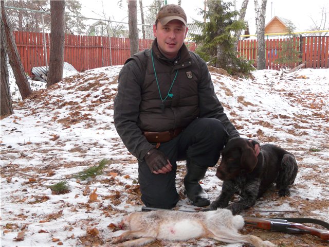 Все меня поздравляют,мой первый зайчик всё таки! Ну а дальше мы еще делаем два захода.Один зайчик поднимается в поле и уходит,идем до машины,обсуждаем охоту!