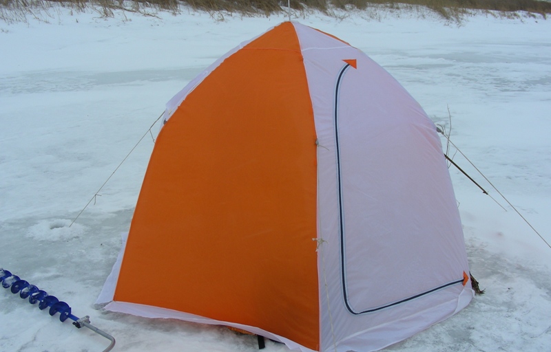 в несильный ветер достаточно снега на юбку а при ветрище приспособил оцинкованные пластины с острыми краями длинной немного поболее диаметра лунки,устанавливаю под углом и натягиваю прикрепляя к палатке держит намертво .