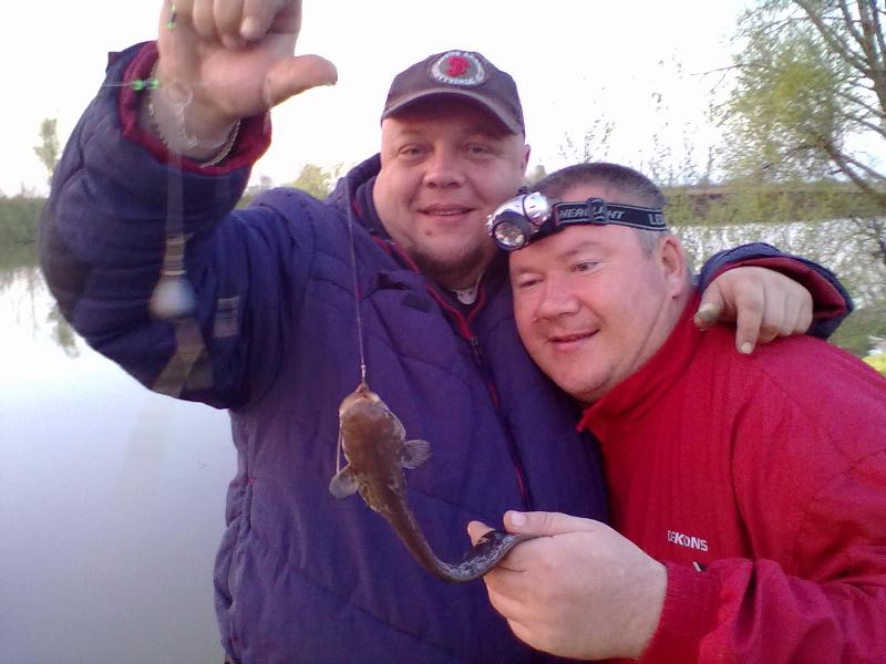 , сначало сосед по берегу сомика дернул, только отпустил-мой товарищ вытащил еще одного.Сфоткались и отпустили.Настроение супер!!!