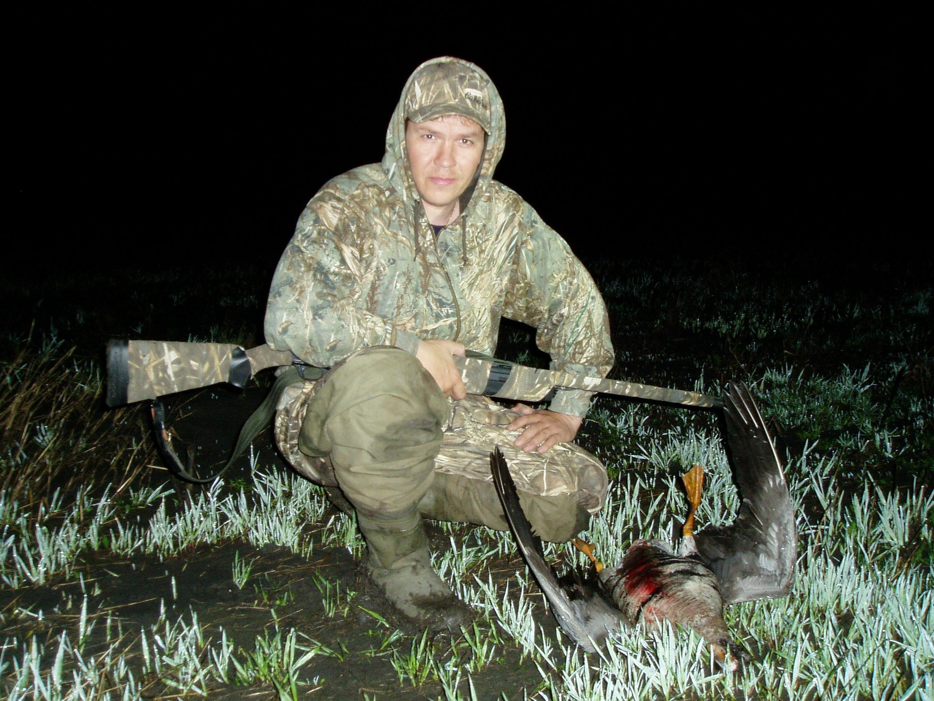 Первый мой сезон охоты.С какой только стороны и чем только не стрелял,слышно как ядро попадает по гусям,а они не падают.Только после того как добрый человек поделился со своими самокрутками 1 гуся все же сбил.Видел как тысячи гусей ходили за трактором пашущим кукурузное поле,как грачи.Путевку взял на земли махеева"ооо Вятка".Гусей мноого.Видимо ночуют на болотах Вятки.Не раз гуси садились к чучелам.Летят с 5 до 7 часов утра.