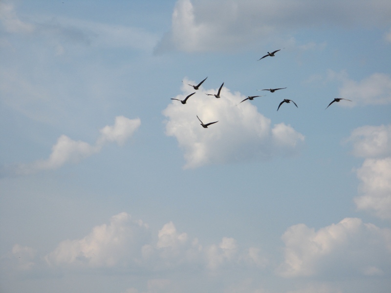 После двухчасового ожидания гусей в подземелье ,не увидев и не услышав их,выходишь на землю,собираешь чучел и на тебе,вот и гуси над головой