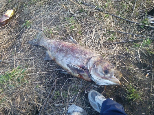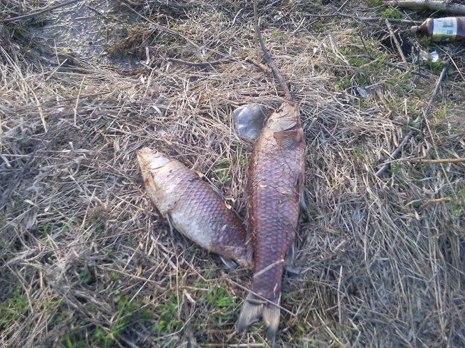 Сегодня днём решил сходить на озеро ,узнать обстановку может рыбаки сидят.Не успел дойти до озера как ко мне подошёл знакомый и сказал что на берегу лежат громадные рыбины .Я конечно не поверил но когда я туда пришёл то увидел страшную картину;на берегу лежат огромные сазаны и просто гигантские !!!!толстолобики!!! Кто бы мог подумать что в нашем озере бывают такие рыбины.Было много щуки и мелкой рыбы.