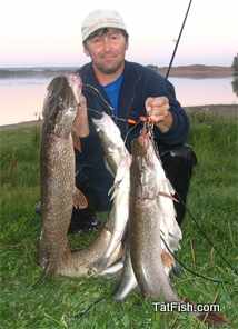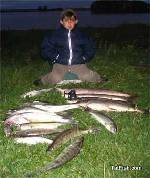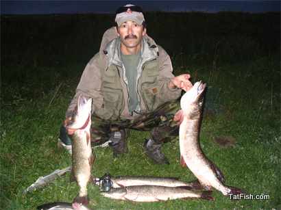 У Роберта щучки где-то 4500, 3000, поменьше и судачки. Две нехилые сошли. Последняя где-то на 6 кг, замотала шнур за кукан, Роберт при этом сломал свой спин. Клев нестабильный, все время перемещались.