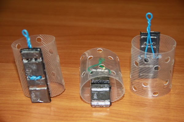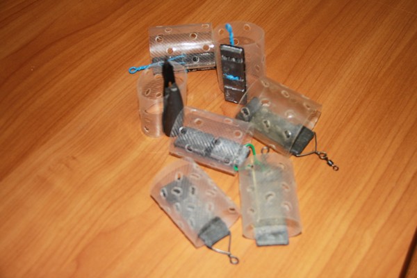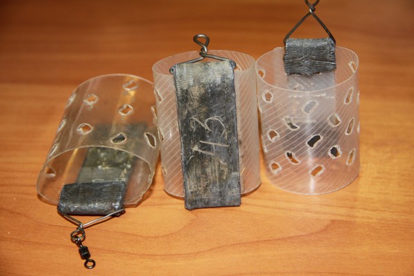 В прошлом году делал из полосок свинца. В качестве вместилища для прикорма использовал коробку из под