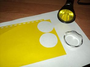 вот таку плёнку думаю легко найдёте.открутил передний ободок по диаметру отрезал и поверх стекла прижал тем же самым ободком.так что никаких протечек и возни.цвет приятный. а то товарищи ставили от полтарашек из под пыва.там цвет темнее-не то.и гасит.а тут нет потери света.