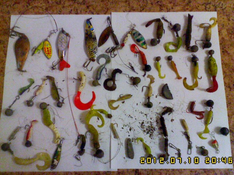 Ловил на прошлой неделе я под Кировским мостом, был 1 судачок мелких (отпустил), 3 зацепа и обрыва, последний зацеп вроде пошел, забрался на мост тяну вверх, а там сетевой ком с кучей резинок на ней, джигов и блесен, оборвал всетаки. Вчера взял якорь с веревкой с собой и выдернул ее, десяток тухлой рыбы с раками, 4 рака живые (распутал отпустил), судачек 20 см. (так же вернулся), ну и все что на фото, 6 блесен, с 30 шт. джиг, поролонок, и кембриков. Может кто узнает свое.