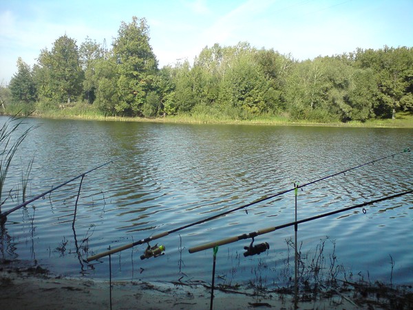 . 2 фидера. Удочку не стал закидывать. Клёв не ахти, но иногда сразу 2 фидера звенеть начинали. Поклёвки робкие. В 17.00 карась-гибрид 740 гр. на червя. Позже рак на опарыш. И жду конца рыбалки (19.00) и вот он карпик зеркальный 560 гр. на опарыш. Заставил он меня побегать по берегу влево-вправо. Всё норовил в траву завести. В итоге с травой его и вытащил. Прикорм "Рыболовство" карп-карась. Я соседу одололжил перлу, на которую у меня не клевало, так он после моего карпика поймал тоже карпика-сазанчика грамм на 400-500. Но всю рыбу не выловишь и я ушёл.