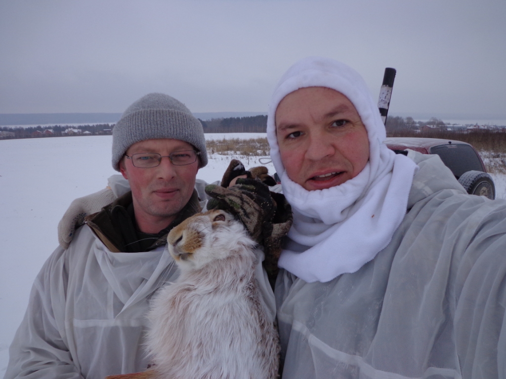 Аналогичное вчерашнему начало дня.Только приплелся во владения своих зверюшек,как задундел долбильник с приглашением побегать за ушканами.Подъехал очередной зеленый друг,только вчера прибывший из далеких северных краев,где хапает длинномерные рупи вахтовым методом.Видимо,так втянут в этот процесс,что на охоту сбегать неколи.Заезжать за моим ружьишком не стали.Прибыли на знакомоое место и я,как безоружный,изобразил из себя загонщика.Одного куяна выгнал на номер неудачно,лису удачно,но изничтожать ее стрелок не стал за ненадобностью.Следующий зверь оказался желаемым,подан на охотника,як на известной посуде,но был лишь подранен.Дав ему успокоиться в течение минут 120,пошли добирать.Но оказалось,что бедный куян нарвался на коллег с собаками,которые его махом изловили.Пришлось начинать все сначала и в результате дополнительной трехчасовой ходьбы удалось все-таки заполевать трофейчик.Конечности сейчас гудють,страх...