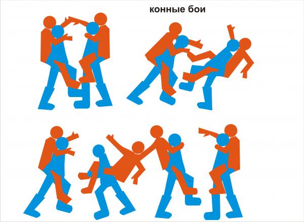 В конных боях участвуют много пар(конь и всадник), последняя пара которая устоит на ногах и опрокинет всех получают призы.