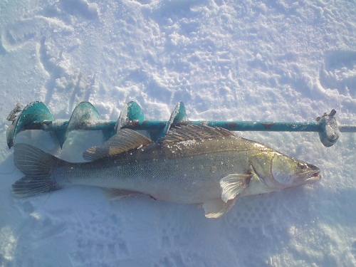 Сегодня Матюшено, 7:45 на точке, небольшая тяга присутствует, глубина ловли 4-6м. Уже на второй лунке закилошный судак и берш 500г.