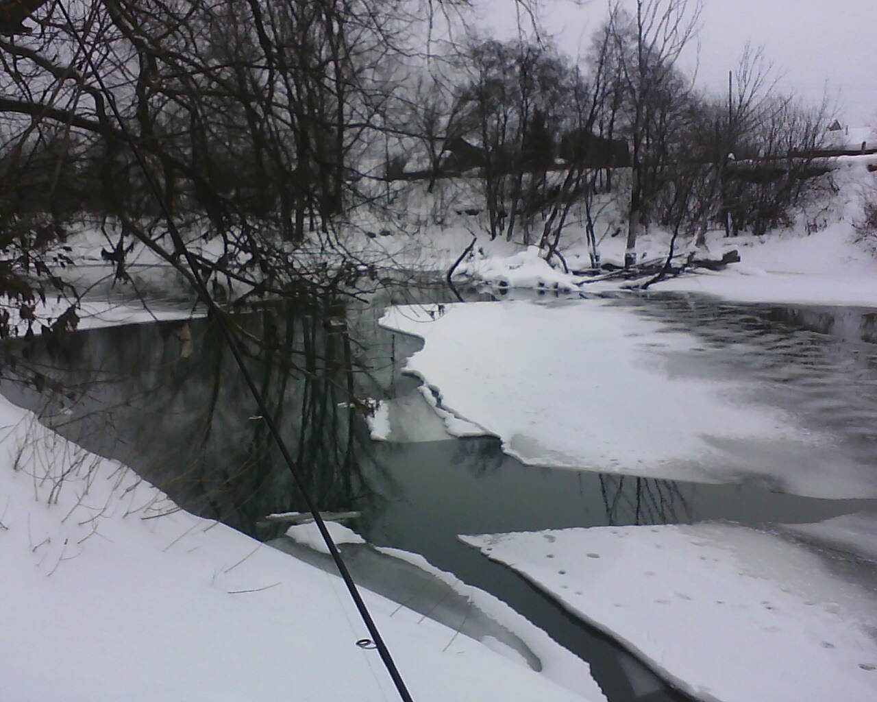 Решили прогуляться до основного русла в сторону Васильево, поэтому пропустили утро в этом месте. Сразу оговорюсь, что в той стороне ничего путного, кроме свежего воздуха не было)…пару поклевок и прозрачные судачки не в счет… за-то лед был похож на лунный пейзаж – через каждые 40 см. пробуренный «кратер» - вероятно в субботу тут кого-то обнаружили).