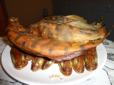 закрываю крышку наливаю воду в гидрозатвор и ставлю на газ сначала 5 мин на сильный огонь , потом убавляю газ наполовину и 40 мин - и все.... опилки беру вишня и ольха 50х50 получается вот такое кушанье.... берш и окунь получаются изюмительно.... можно каптилку брать с собой на рыбалку.Можно коптить все что угодно сало курицу ...и никакого дыма и запаха в кухне !!!