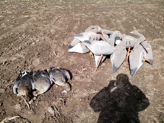 Приехали в 3 на поле,выкопали 5 ям, навели маскировочку, ближе к 5 часам прилетела пара, дали им сесть. Потом пошли стаи, но они все проходили высоко над нашим полем.Вот одна начала снижаться, маню делают круг и заходят еще на один , кричу-"бьем!", залп и три гуменника вываливаются. Лежим , летит пара маню, приближаются, "огонь"- первым "тройкой" успеваю выбить ведущего, второй даже после залпа уходит целехонький.Больше реальных налетов не было, меняем место дислокации и роем ямы на краю оврага для следующего дня, гусь продолжает концентрироваться на соседнем поле.