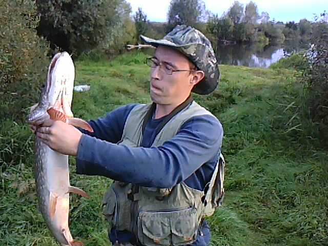 Вода немного ушла, тяга сильная. Первое впечатление о клеве - никакое, но через 30 минут пессимизм был развеян воплем Евген Дреича: "ПОДСААААК!!!" Минут десять fanat уговаривает щуку идти к папочке, потом вместе минут 5 уговариваем идти ее в подсак. Не хочет, говорит, что жмет в грудных плавниках. В оконцухе Евген буквально запихивает щуку в подсак руками, лежа на береговом уступе.