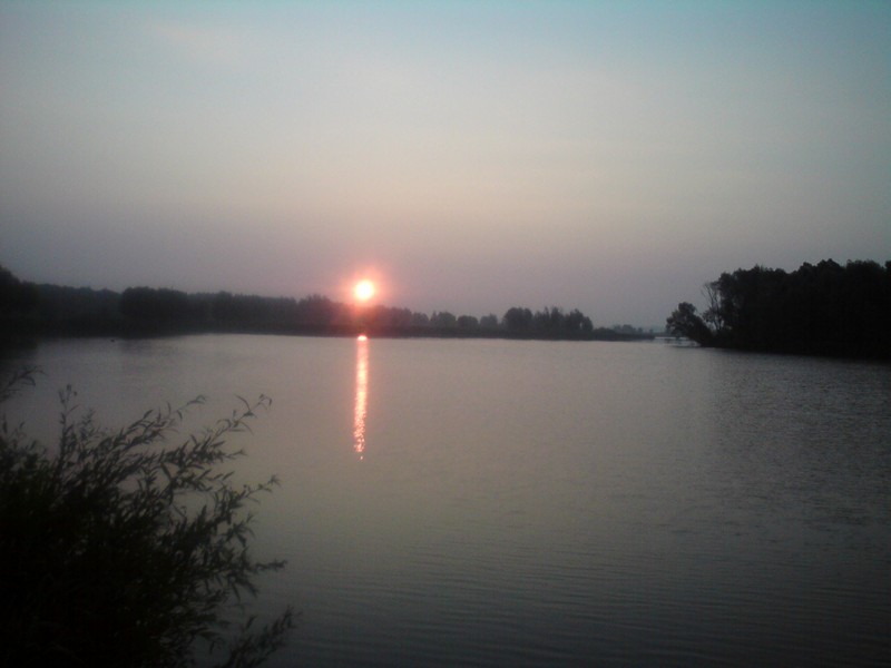 Утром в 3.30 началось вторжение желающих поудить. Причём они перебегали болотце со всем скарбом очень быстро и также быстро занимали места. Насчитал 25 машин на бетонке и 5 вездеходов на берегу. Утро меня ничем особо не порадовало, не считая восхода, который очень красочно осветил реку. Только карасики. Мужичок под берегом на удочку пару сазанчиков докилошных выудил.
