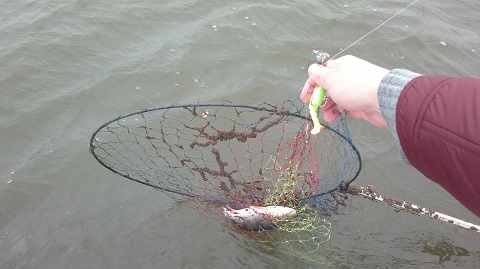 Меняю точку, и после продолжительного макания под дождем силиконовых рып различной окраски ловлю еще одну щучку, тут "новый" подсак сразу и обрыбился.