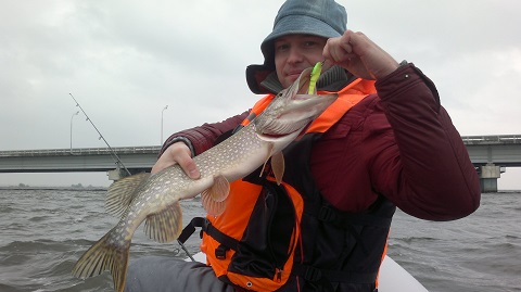 Подвожу ее ближе, беру за леску, а она резко головой в сторону и... срез!!!! Пол секунды оцениваю ситуацию, щучка стоит в 50-70 см от лодки, делаю резкий рывок и ловлю ее руками!