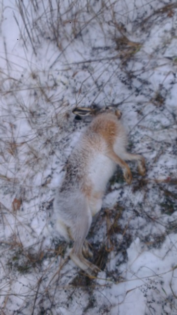 В субботу после работы (закончил в 12.00) рванул за косым в ближайший заброшенный карьер, погода мело  как в трубу ну и как закономерное следствие ни одного следа замечено не было, облазил все кустики и уже хотел возвращаться домой как косой вылетает из бурьяна, я дуплечу и вижу как косой на всех порах уходит от меня на четырех лапах. Решаю проверить так как был уверен что не мог промазать должен был хотя бы зацепить, после 80м. замечаю каплю крови иду по следу (хотя стоило подождать но приближающие сумерки и метель делали свое дело), пройдя метров 700-800 замечаю скидку в сторону большого валуна и вот он красавец делает прыжок но к моему счастью и его несчастью я не мажу. Вечером придя домой я выполняю все пожелания младшему сыну хвостик и всем котлеты из дичины, все счастливы.