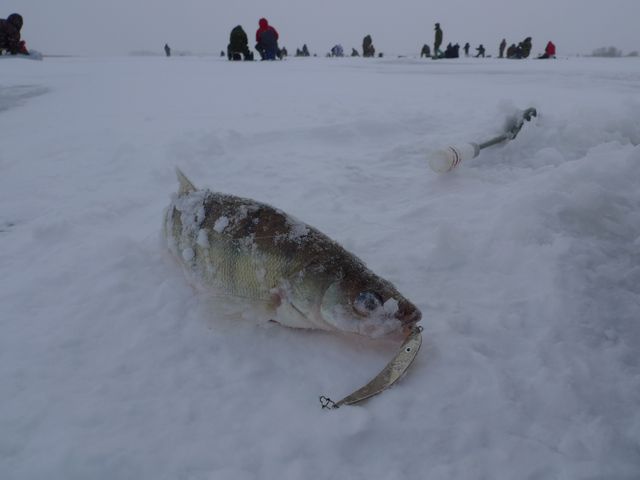 Максимальный улов у мужика рядом около 12 шт. бершей. У соседа была поймана щука на килошник на мормышку. Я плюшевый рыбак - всего два берша на блесну с фосфорной полоской. В 13:00 как отрезало и домой! Вобщем, как всегда если к вечеру холодает, после обеда нихрена не клюет! Ветер с 10 часов был 20 м/с наверное