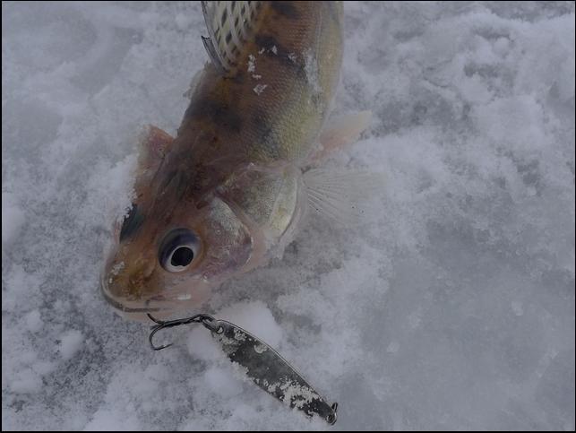 , как летом, в итоге рыбка осчастливила только меня, 2 окушка по 150 грамм, братья близнецы, были отпущены после 30 мин салярия на льду