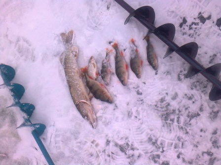 .Разбредаемся по одному. Окунь ну очень капризный, на балансир со дна ладошечный размер, 1- 2 c каждой 10-ой лунки. Бабаи ловили почаще на мотыля, но размер окуня оставлял желать лучшего. Общий итог оценил только мой кот, и тот с сомнениями.