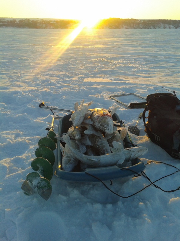 Вчера 25-го Волга. Посмотрев давление решил проверить свал с меляка в русло. До обеда две нереализованные поклевки, причем один сход не мелкой рыбы. На горизонте только двое мужиков метрах в 500 от меня. После обеда пошел в их сторону, и не дойдя метров 100 пробурился проверить глубину. С ходу три поклевки и тишина. 5 метров в сторону берега - пусто. 5 метров в другую сторону и еще четыре судачка и опять затишье. Мужики тем временем собрались и ушли. А я остался в полном одиночестве. И никого до самого горизонта. После этого пробурил еще штук десять лунок и обходя их периодически получал поклевки. Все поклевки на свале с 4 на 9 метров, глубже тишина. Приманки "мухомор" и балансир. Итого 11 судачков и один берш, мелочи не было вообще. Штук десять сходов за день из-за собственной неуклюжести.