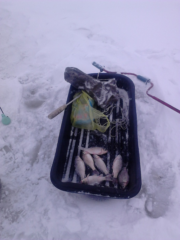 , ветер просто сильнейший, прятались за снегоходом, в часов 11 немного стих на 1,5 часа и вот в это время ушёл от нуля, первым меня согрел 700 гр берш, с поклевкой как килошного судака, далее начал искать бурить, понял что рыбка начала шевелиться, и вот нашел небольшой бугорок , примерно 40 см, и как из пулемета с него 5 штук к ряду, з судачка до кила и пару бершей по 800 гр. Пока насаживал тюльку после последней рыбки, по спине начал хлестать такой снег и ветер вновь усилился до утреннего и сразу как отрубило, было решено ехать домой, итого 3,5 кг.