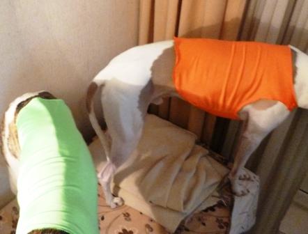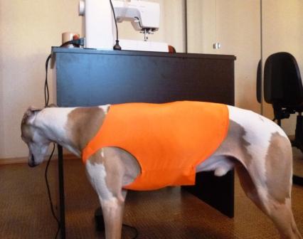 Только я решила делать не попонку с хлястиками, а именно майку без лишних элементов. Надеюсь, стрелки, если что, примут яркий собачий наряд за человечий и не станут губить собаку.