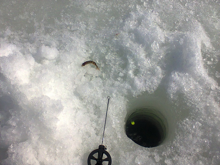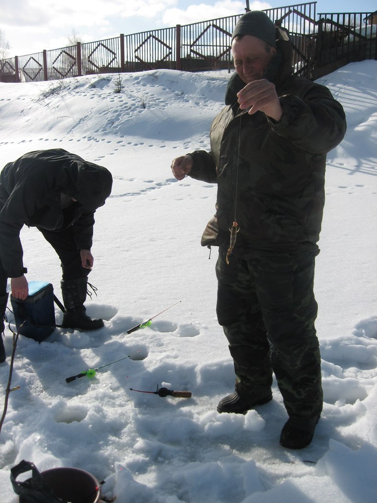 Погода нормальная, если не считать сильного ветра. Около часа мучался с тонкой леской и легкими мормышками. Потом вспомнил, что в ящике лежит поплавочка. Оснастил отводным, и жизнь (в смысле рыбалка) наладилась. Первый раз рыбачил зимой на поплавок, оказалось -Весчь!