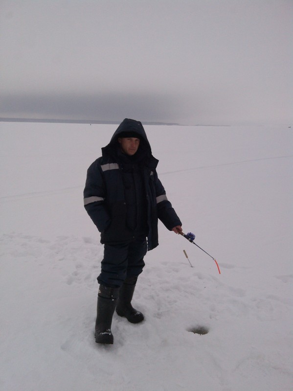 Вчера, К.Устье в сторону Лобача минут 40 пути. Глубина 10м, слабая тяга. Легкий морозец, полный штиль. На лунке в 7.30. как всегда, сначала попробовал прыщ, но впустую, поставил "Клео" сразу берш гр. 300, потом тишина. Сделал несколько переходов, такая же глубина-поклевок 0, поставил "Чинок" перламутровый, пару взмахов...Удар!, и вот сударь больше кила на льду