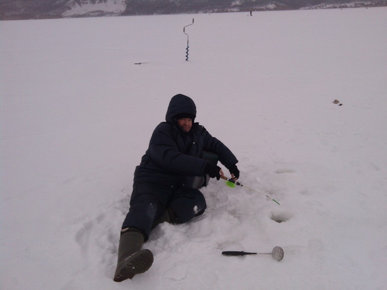 Сегодня, Затон в сторону Кудрявого, второй свал. На "собачке" вдвоём с товарищем.Погода прелесть, правда ветер восточный. Глубины около 10-12м. Слабая тяга.Пробурено не менее 40 лунок. У меня крупный ЛОСОСЬ. Товарищу повезло больше, наковырял 5 судачков, самая большая грамм 800. Сработал жёлтый с красной наклейкой прыщ 6.(у меня такой не было