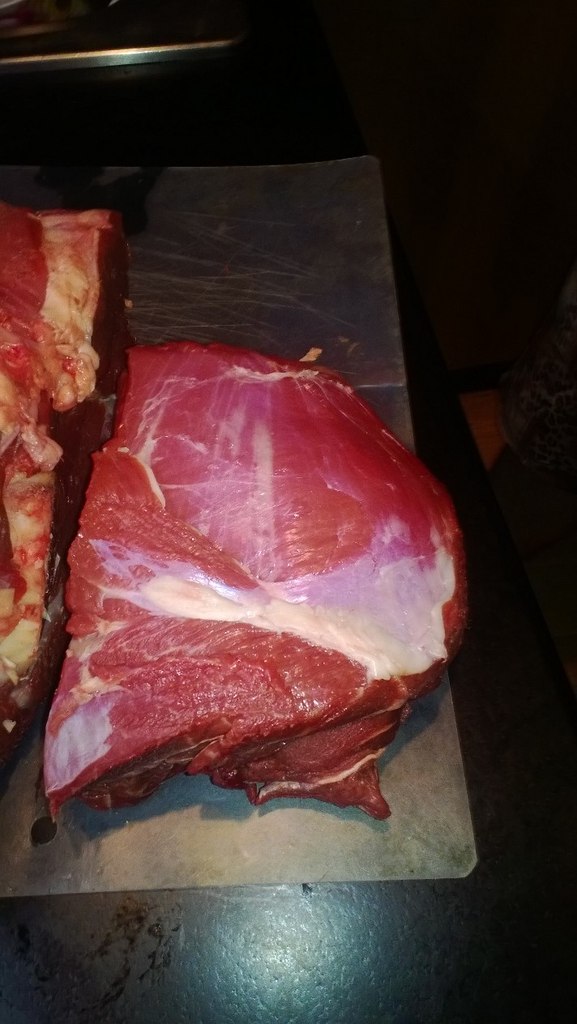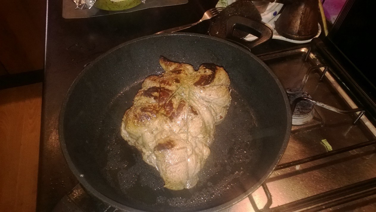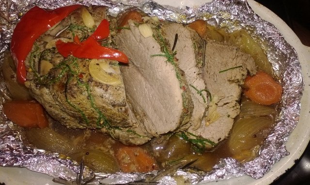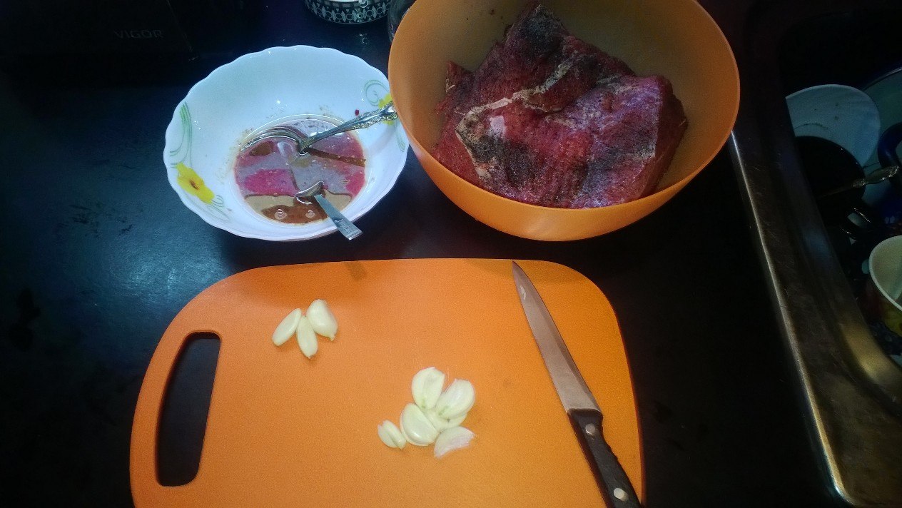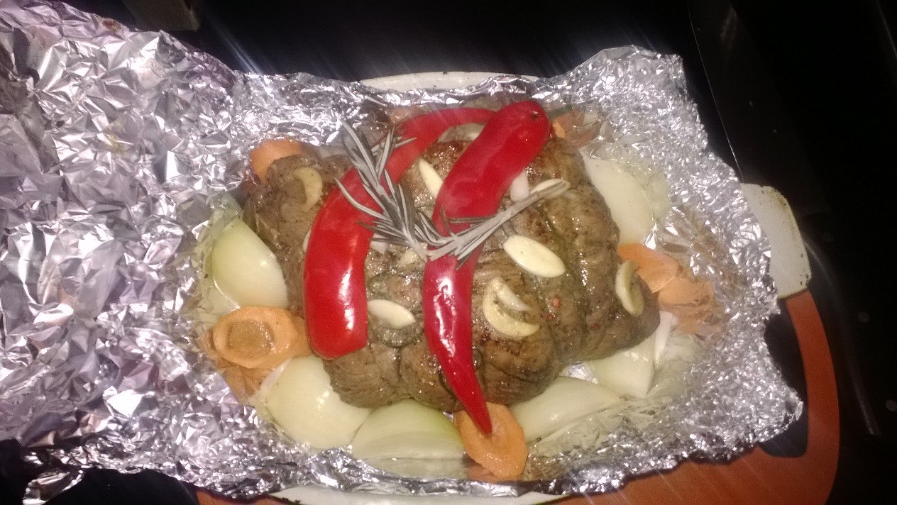 В идеале для приготовления нужна мраморная говядина, но и такой кусочек пойдет (около 1-го кг.) мясо должно быть комнатной температуры, чистим его от пленок, маринуем в смеси соевого соуса, мёда, французской горчицы, аджики, оливкового масла ( у меня обычное), чеснока и смеси перцев. Оставляем мариноваться на часок, периодически его поворачиваем. Перед жаркой мясо слегка солим и плотно обматываем жгутом, и на раскаленной сковороде обжариваем со всех сторон примерно по минуте (перед жаркой весь чеснок с мяса убираем, он еще нам понадобиться). Затем выкладываем мясо на фольгу в посуду для запекания, на мясо со всех сторон кладем наш чеснок, вокруг мясо кладем лук с марковкой, я на мясо положил еще перчик чили (он был плюшевый, поэтому так много положил) и веточку розмарина. Мясо плотно заворачиваем в фольгу и мин. на 45-50 в раскаленную духовку. Если бы готовил только для себя мин. 25-30 бы только подержал, люблю не до конца прожаренное.