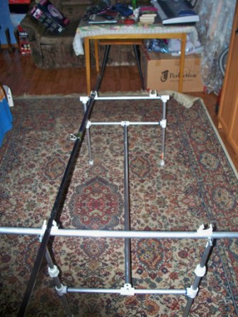 Материал задней стойки - алюминиевая трубка 20 мм, две заглушки 20мм, пять тройников 20мм. Можно использовать 18мм. трубку будет чуть дешевле.