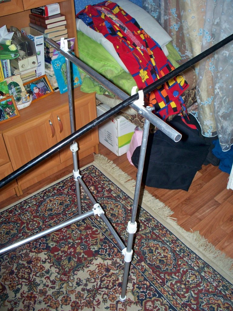 -Передняя стойка. Складывается до квадрата (80) 50х50 см., - верхняя перекладина трубка 22х800 мм. (остался обрезок от поперечины лениво было резать) вылет стойки по высоте до 95 см. Материал для передней стойки: ножки трубки 20мм. и трубки 16 мм.Узел фиксации вылета по высоте- сальник для кабеля. Поперечина трубка 20 мм, планировалось также крепление на тройники, но просчитался в количестве - закрепил болтами. Тройники 20 мм, две заглушки 20мм.