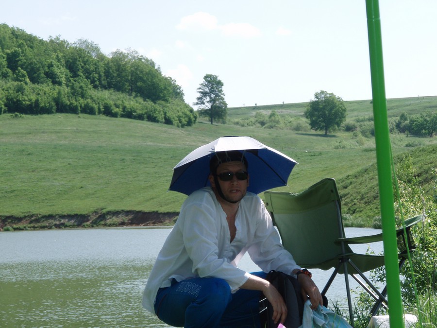 Немного наконец-то помочил свой новый подсачек. От жаркого солнца я спасался головным зонтом, заказанным из Поднебесной. Поэтому вот этой рожицы